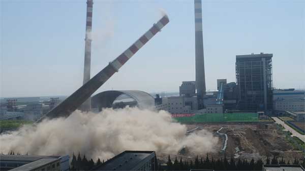 2017年5月18日14时28分,连云港明达工程爆破有限公司成功拆除了射阳港发电有限公司内的两座烟囱。烟囱按设定方位倾倒,整个爆破取得圆满成功,此次爆破为江苏省内完成的首例同时爆破拆除两座高达150m的混凝土烟囱。